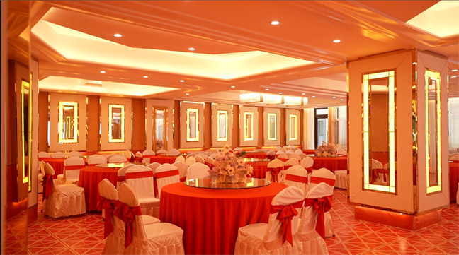 鉑金大廳—色彩濃烈,現代式裝修,面積560㎡,層高6米,開合大屏配合舞美燈光,唯美震撼,可承接30桌的中型宴會;12米長的可移動T臺收起后,就變成了可容納400人同時落座的大型多功能會議室。